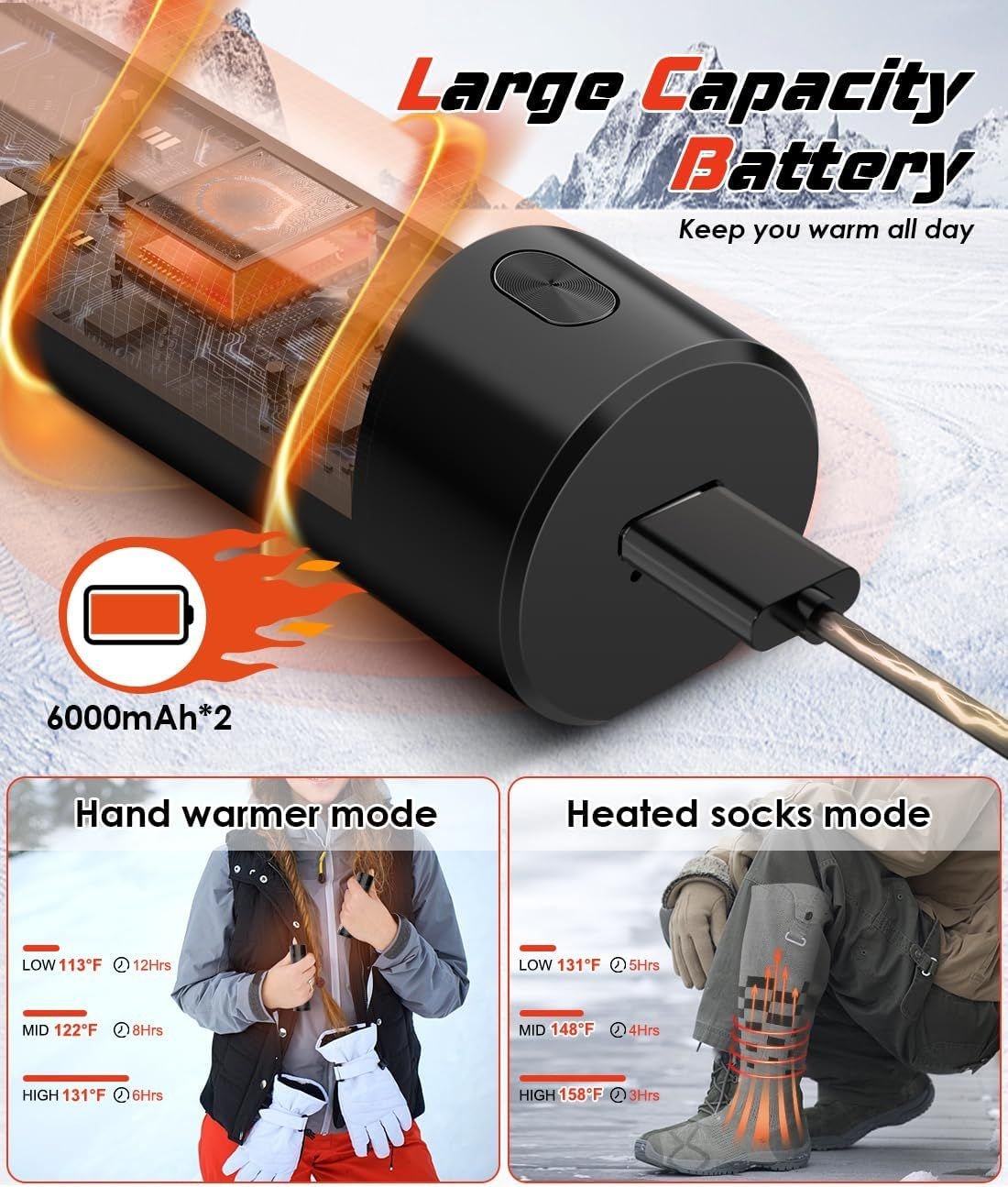 [Super Battery Life]- The hand warmer we equipped has a built-in 6000mAh battery, which provides excellent use time. Hand Warming Mode: You can enjoy continuous warmth for up to 12 hours. Foot Warming Mode: You can enjoy continuous warmth for up to 6 hours. Whether you're on a day hike or a winter camping trip, this heated set will keep you warm outdoors.